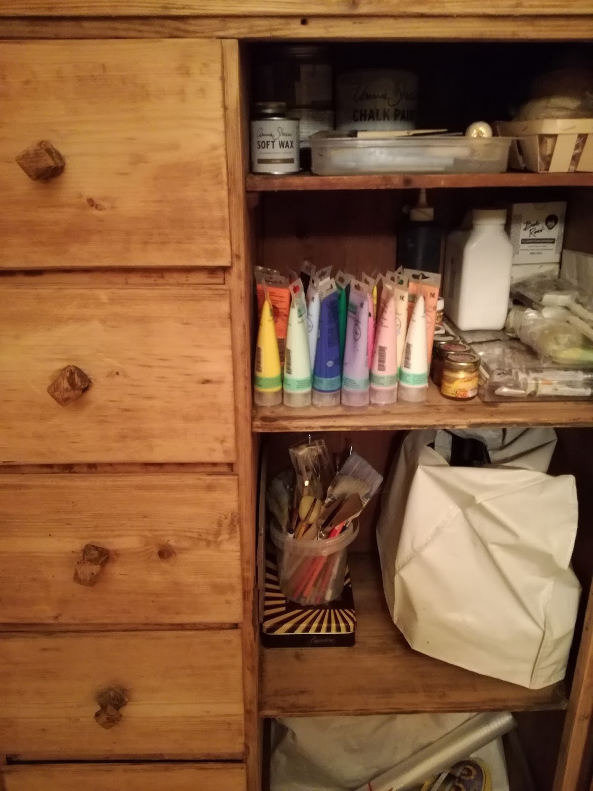 Nakoľko som prepadla maľovaniu a farby a štetce nemám už kde držať, tak som si z nej urobila takú svoju HAND-MADE skriňu. Konečne aj moje šijacie stroje majú svoje miesto, nite, a gombíky a všetko možné sa z rôznych škatuliek premiestnilo do zásuviek.