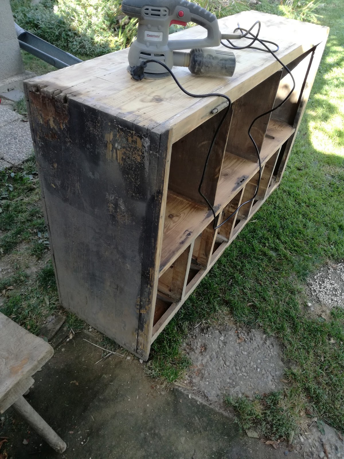 Nakoľko som potrebovala nejakú skriňu na moje farby a štetce, šijacie stroje a šijacie potreby a v neposlednom rade manžel potreboval miesto v garáži, kde som ju odložila takú rozobratú a nedobrúsenú. Tak som sa vzchopila, vonku už nebolo 35 stupňov, ani dážď, počasie akurát.